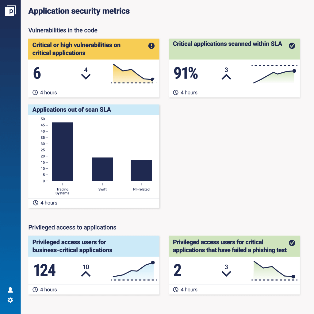 "That’s where you need a tool like Continuous Controls Monitoring to not only automate much of that process, but also to help understand the priority of those fixes across all applications, and crucially, to ensure that they’ve been fixed. As well as understanding and ensuring that applications are being scanned, and scanned when they should be." Here's a dashboard that highlights example metrics: