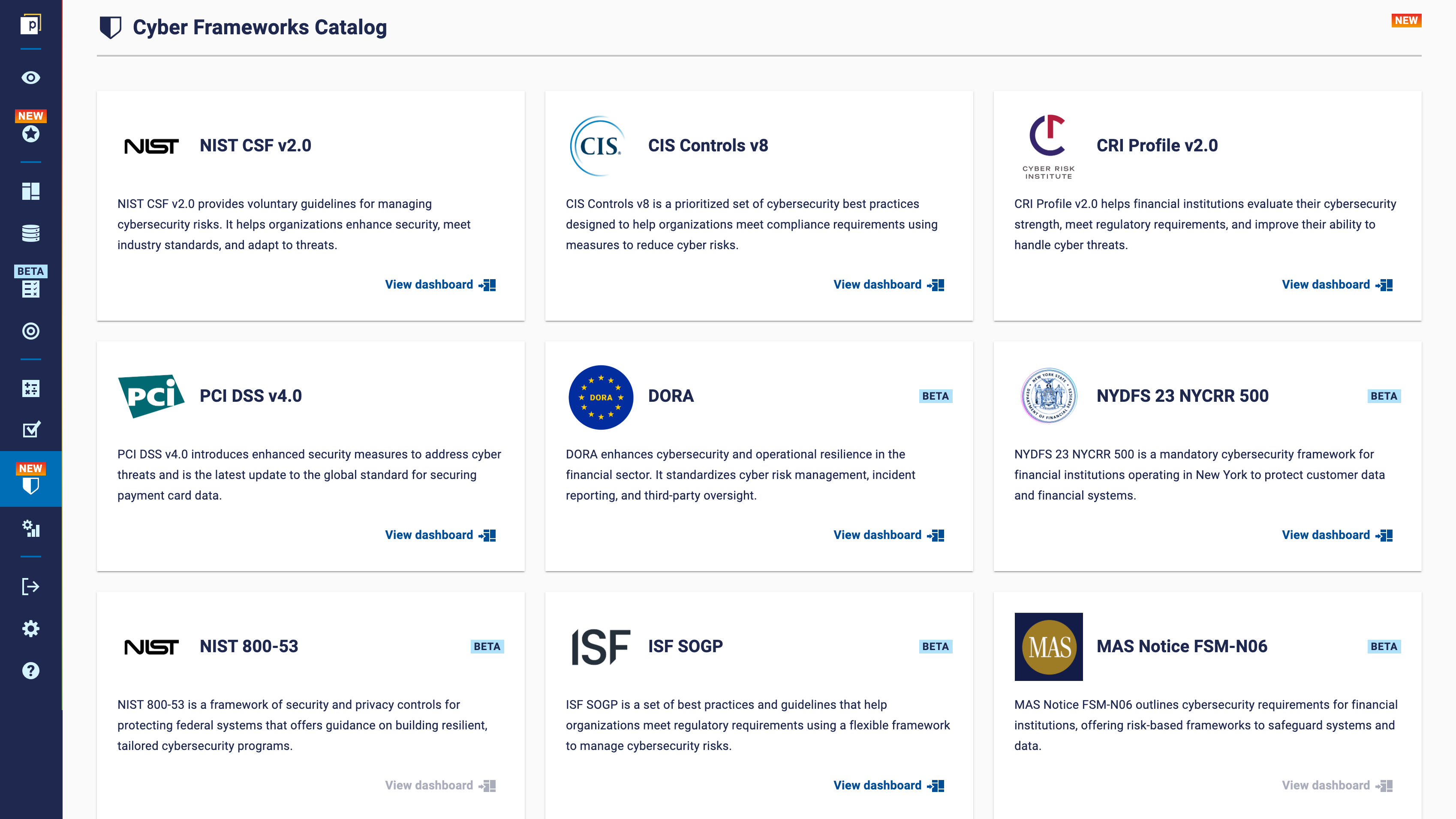 We offer ten pre-built dashboards covering over 200 control metrics aligned with major cybersecurity frameworks, including NIST CSF v2.0, CIS v8, PCI DSS v4.0, and the CRI Profile v2. In addition, DORA, is supported through a dedicated dashboard with tailored metrics. These dashboards provide security and GRC teams with a real-time, comprehensive view of compliance and control effectiveness, all aligned with leading industry standards.