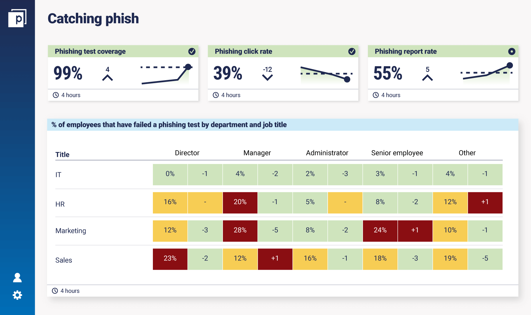 It provides the added business context, breaking down employee user awareness performance by department and job seniority. The +/- indicator to the right of each percentage shows the difference versus the previous measurement. With dashboards like this, you can see how the changes you implement to your security programme are having a real-time effect on its efficacy.